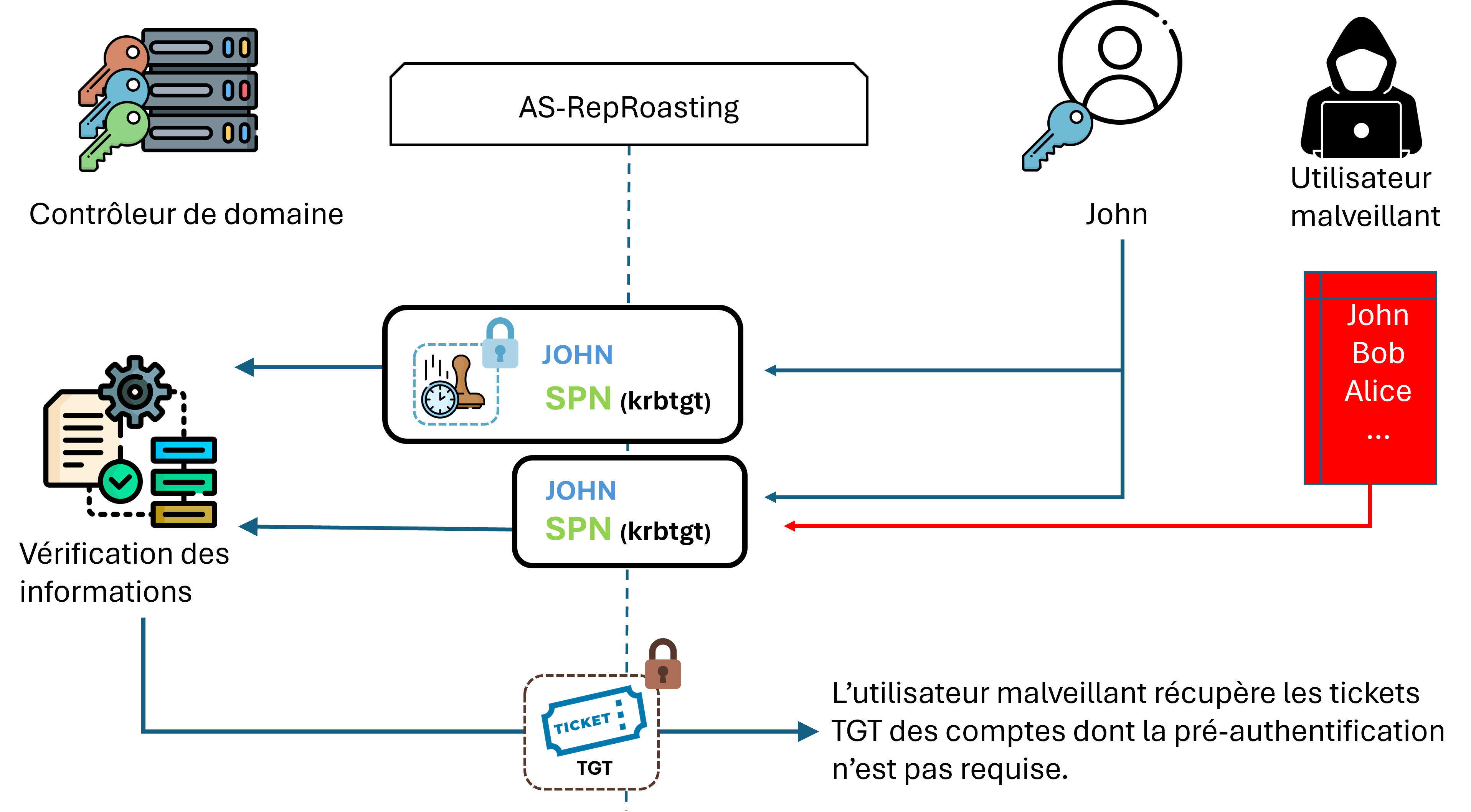 Dans le cas où la pré-authentification est désactivée pour un utilisateur, il peut demander un ticket TGT sans s'authentifier.