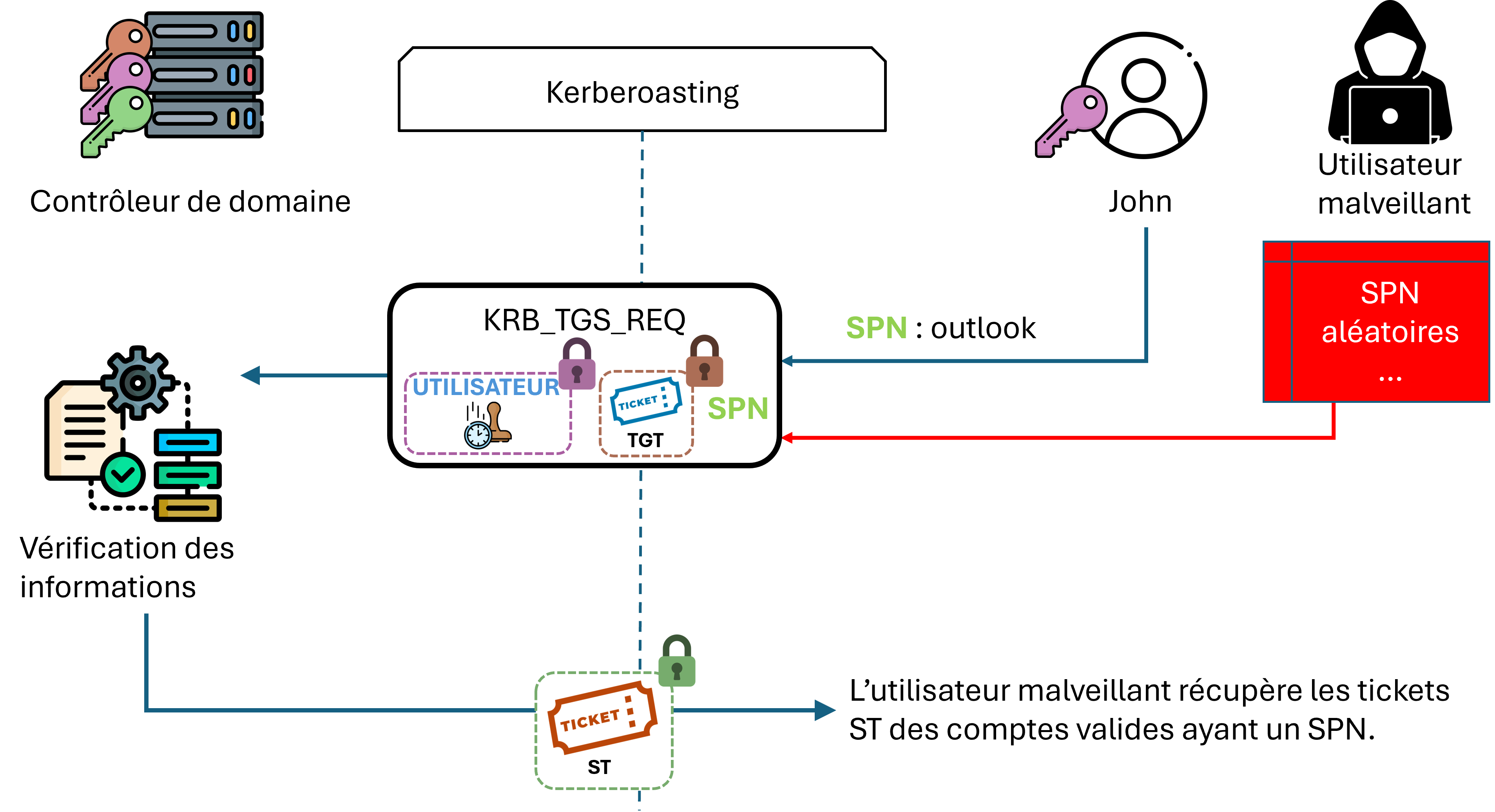 L'attaque Kerberoasting a le même objectif d'obtention d'une signature, sa récupération s'effectue alors par la demande d'accès à un service. Un utilisateur possède la capacité de demander n'importe quel service auprès du contrôleur de domaine, c'est au service de vérifier si l'utilisateur en a bien l'accès. Un attaquant va donc effectuer des demandes de tickets de services (ST) en indiquant des noms de services (SPN) arbitraires.