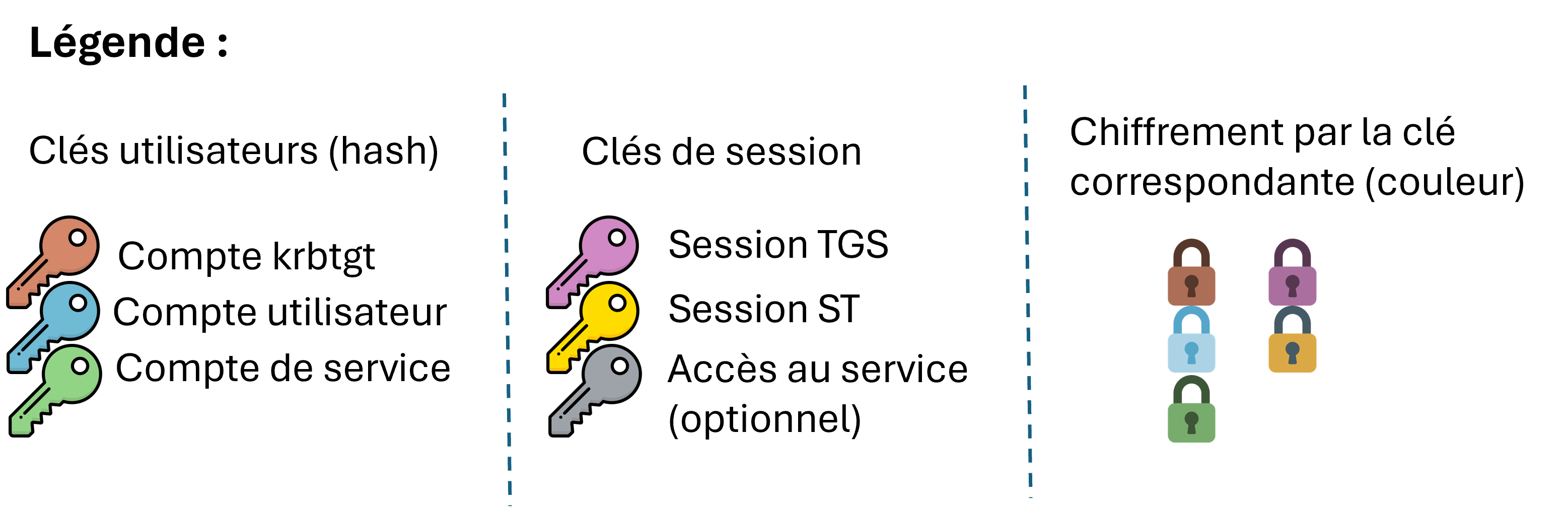 L'utilisateur est à l'origine des requêtes pour chacune des étapes. L'ensemble des clé échangées pour l'accès à un service est listé ci-dessous dans la légende.