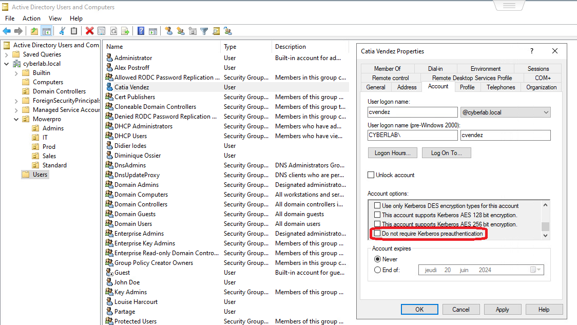 Afin d'éviter une usurpation d'identité pour récupérer un TGT, il faut activer la pré-authentification. L'activation de la pré-authentification doit être configurée sur tous les utilisateurs.