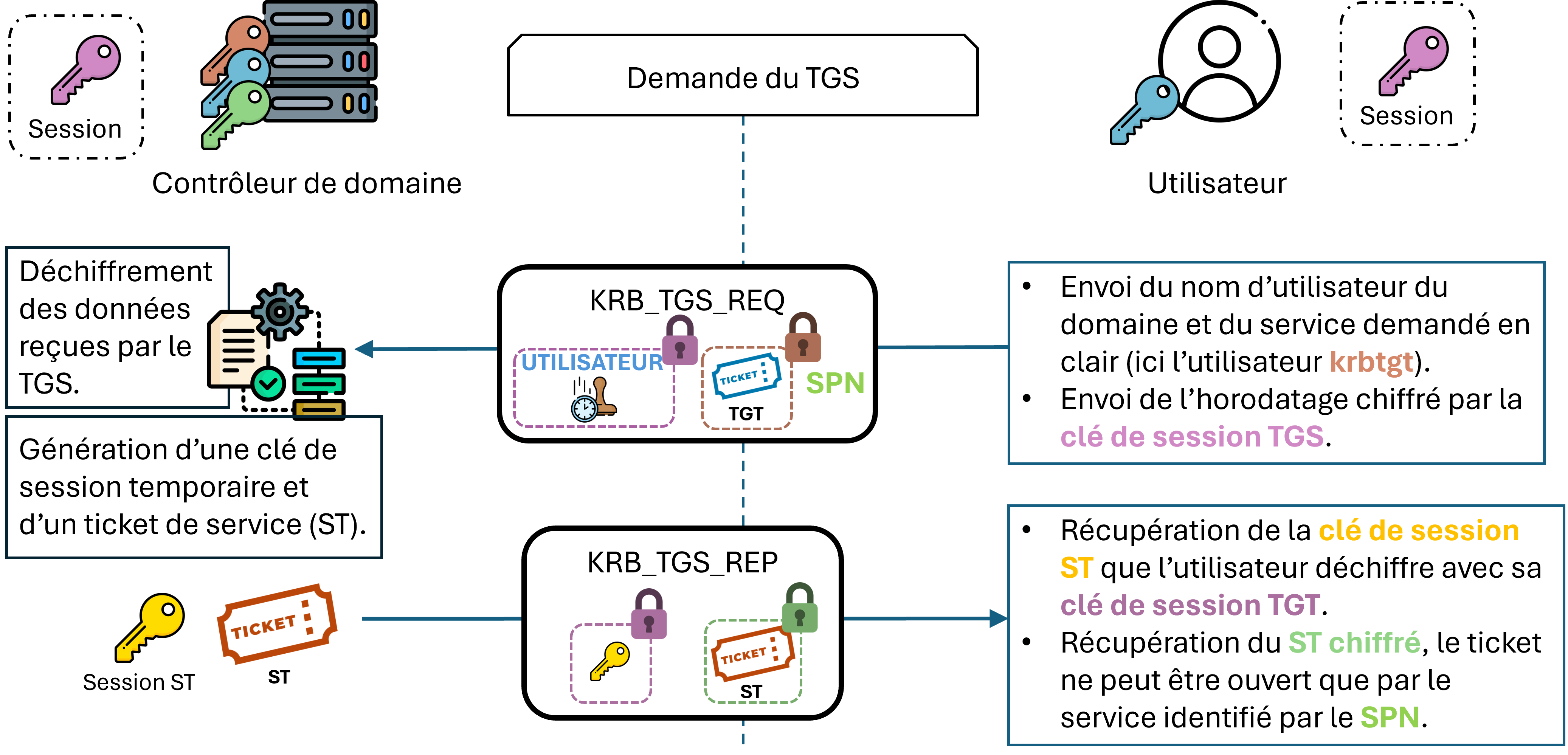 Ayant le ticket TGT, l'utilisateur fait une demande d'un ticket de service ST sur le service TGS (Ticket Granting Service) du contrôleur de domaine.