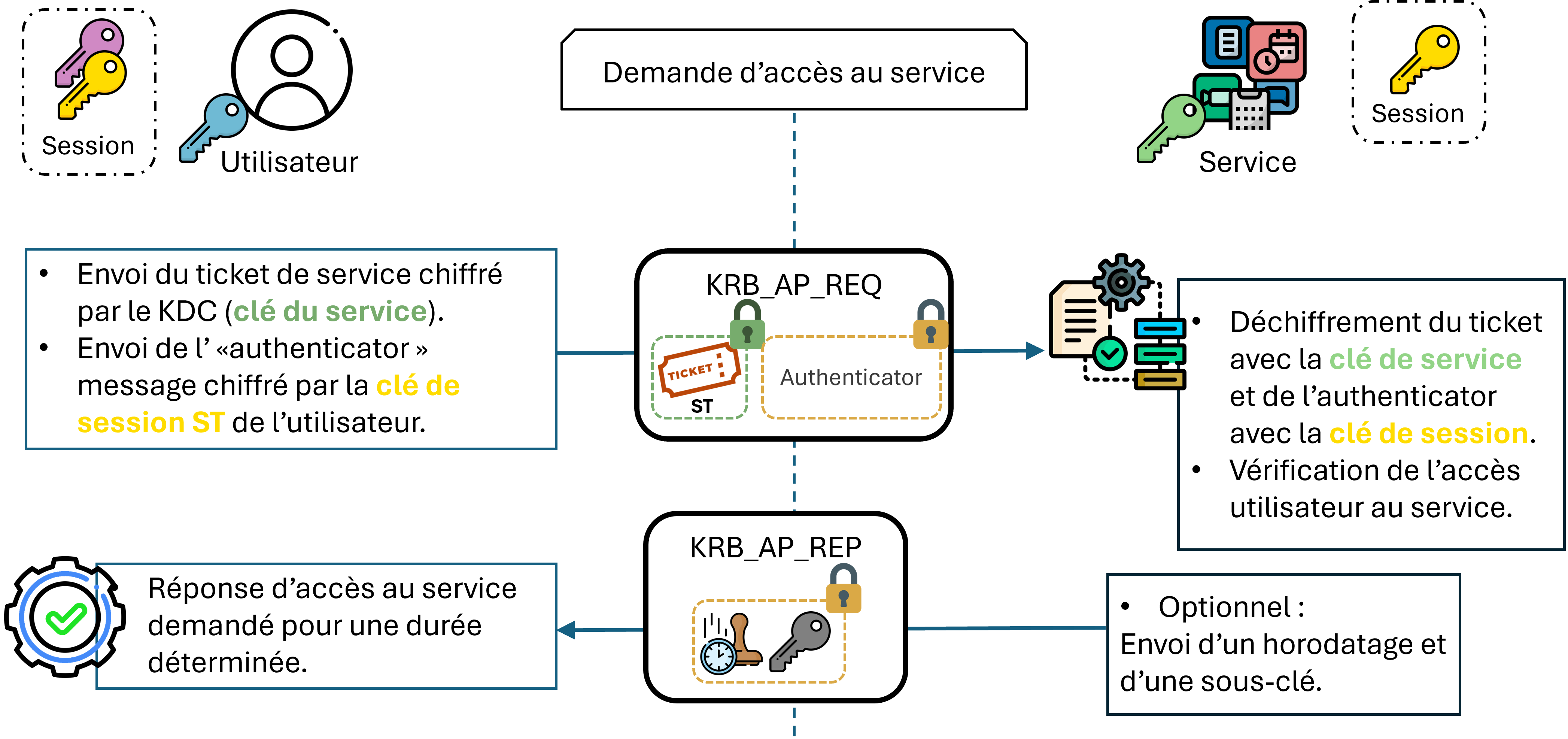 Une fois le ticket de service récupéré, l'utilisateur demande l'accès au service en lui envoyant le ticket correspondant. Il peut alors utiliser ce service, étant authentifié sur celui-ci.