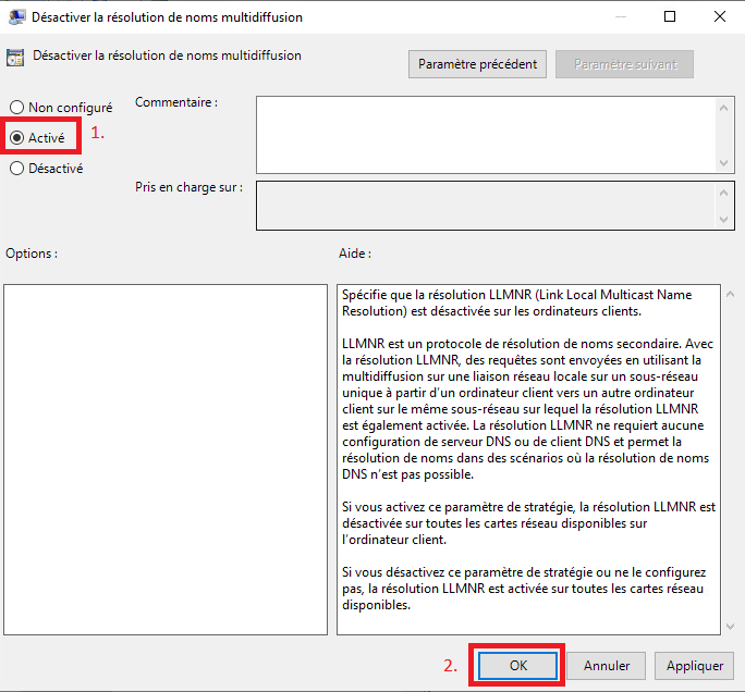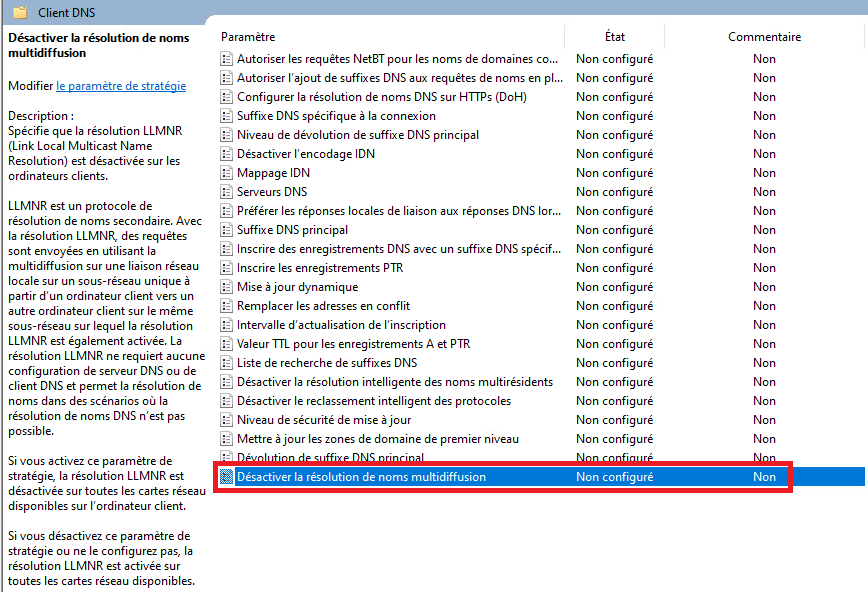 Il est fortement recommandé de désactiver les protocoles tels que LLMNR, NBNS, et mDNS dans les environnements réseau, car ils peuvent présenter des vulnérabilités potentielles en permettant à des attaquants de fournir de fausses informations de résolution de noms, ce qui pourrait compromettre la sécurité du réseau. Pour ce faire, vous pouvez utiliser des GPO pour désactiver LLMNR et mDNS, et configurer des paramètres appropriés dans votre infrastructure DHCP pour désactiver NBNS. Cette démarche contribuera à renforcer la sécurité de votre réseau en éliminant les vecteurs potentiels d'attaque exploitant ces protocoles et en garantissant que la résolution de noms s'effectue de manière plus sécurisée et contrôlée par le biais du DNS.