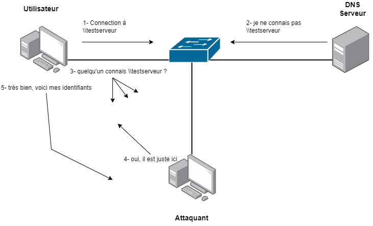 Dans un réseau, un attaquant peut écouter les protocoles LLMNR, mDNS ou NBNS pour intercepter des requêtes de connexion mal adressées. Par exemple, si un utilisateur essaie de se connecter à un serveur \\testingserveur avec une adresse mal saisie (ex. \\testserveur), et que cette requête ne trouve pas de correspondance au niveau du serveur DNS, le système tente alors de trouver le serveur via LLMNR, mDNS ou NBNS. L'attaquant peut répondre à cette requête, prétendant que l'adresse mal saisie pointe vers son propre système.