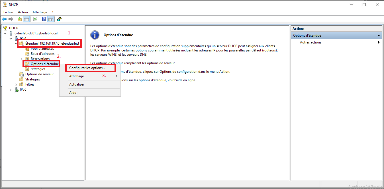 Accédez à la gestion DHCP, puis faites un clic droit sur "Options de la plage" correspondant au réseau que vous modifiez, et cliquez sur "Configurer les options".