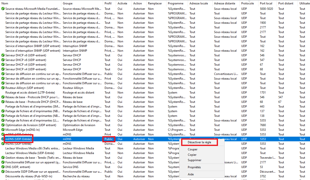Pour désactiver le MDNS, rendez-vous dans les fonction avancées de sécurité du par feu de Windows Defenders. Recherchez let désactivez a règle mDNS(UDP-Entrée) sur les profiles "domaine" et "public".