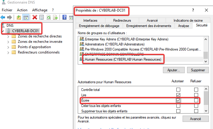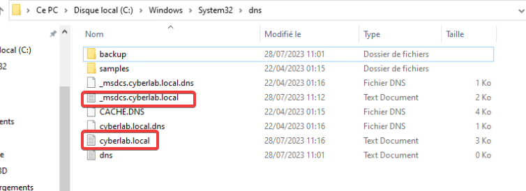 Exporter les zones DNS présentes sur le serveur. Ici "_msdcs.cyberlab.local" et "cyber.local" sont les nom de la zone DNS;