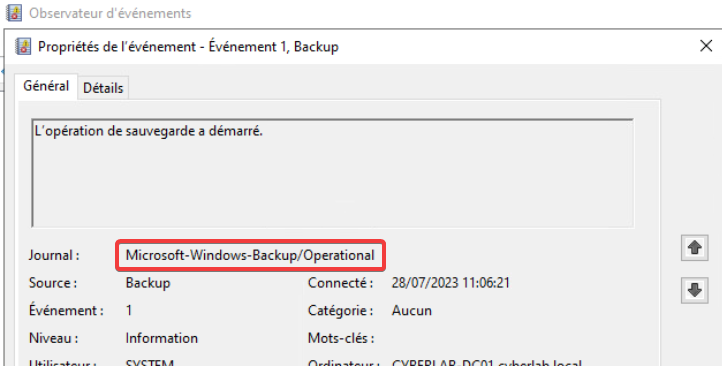 S'assurer d'avoir également une sauvegarde qui est stockée hors ligne et de surveiller les évènements concernant les sauvegardes. Tous les évènements se trouvent sous Microsoft-Windows-Backup\Operational