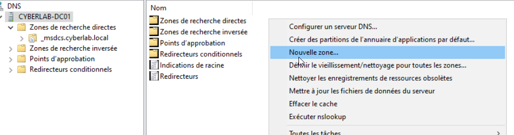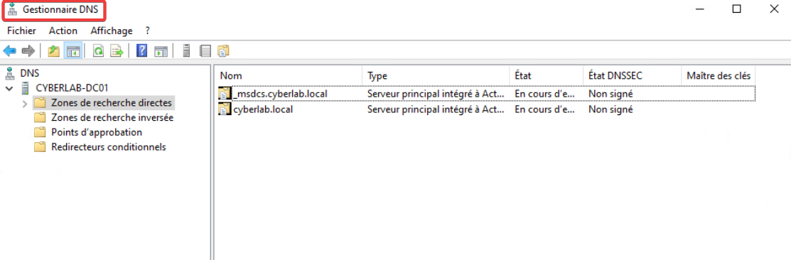 Dans ce guide, nous utiliserons les zones DNS cyber.local et cyberlab.local pour illustrer les étapes et méthodes de traitement. Vous devrez faire correspondre ces informations avec votre propre contexte d'exécution.