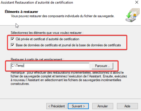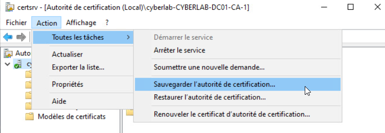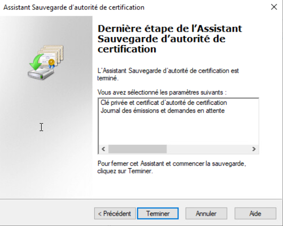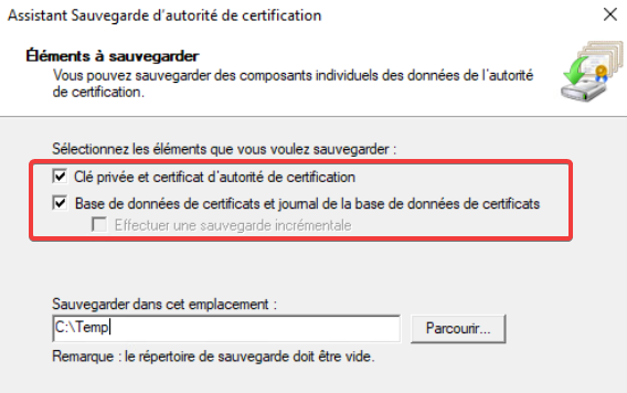 Faire une sauvegarde de l'Autorité de Certification en sélectionnant bien ces deux cases.