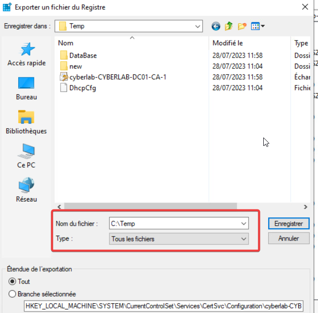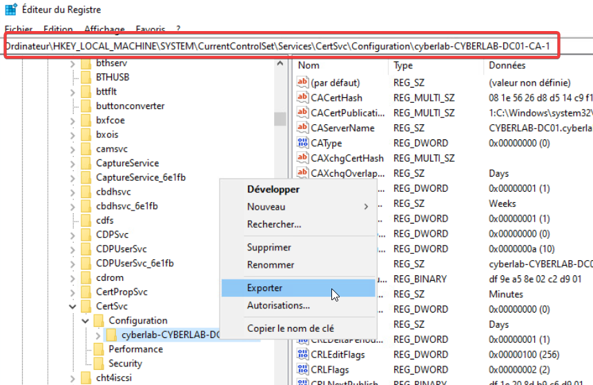 - La configuration du CA doit être enregistrée également, on la trouve sous HKLM\System\CurrentControlSet\Services\CertSVc\Configuration\