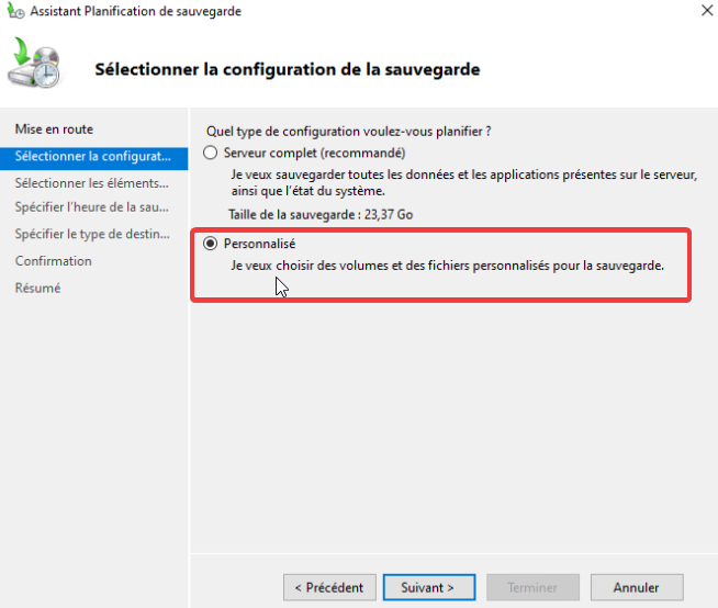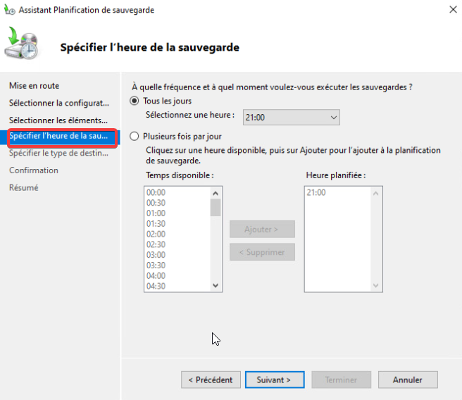 Cliquer sur Planification de sauvegarde puis sur Suivant;