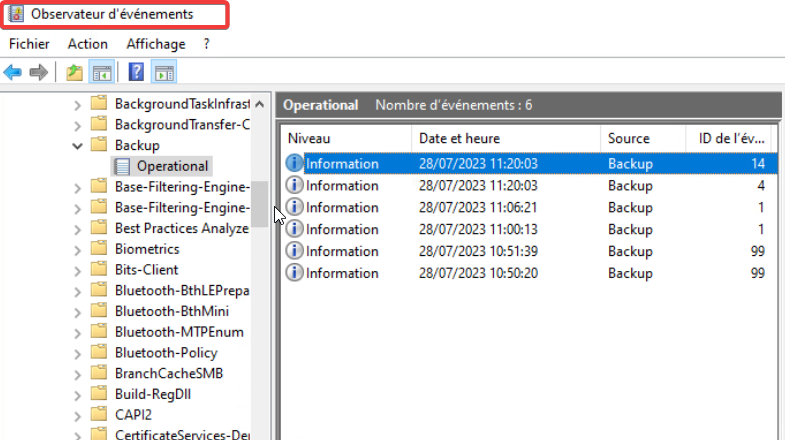 Tous les évènements concernant les sauvegardes se trouvent dans le dossier Microsoft\Windows\Backup\Operational, et l’évènement sous l’ID 14 indique qu’une sauvegarde est terminée.