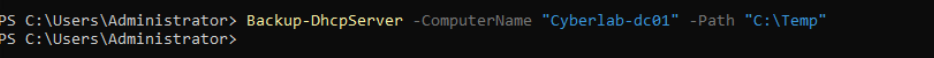 Backup-DhcpServer -ComputerName "Cyberlab-dc01" -Path "C:\Temp"