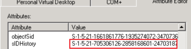 Ici, nous pouvons voir un attribut SIDHistory d'un utilisateur qui a été migré.