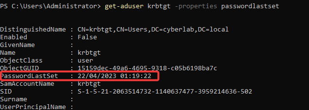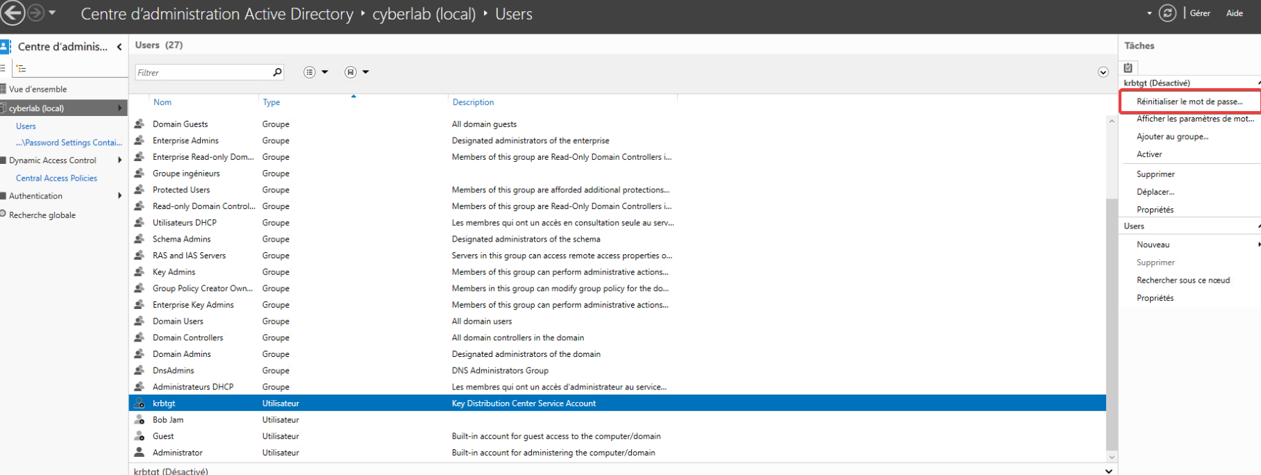 KRBTGT : Key Distribution Center Service Account (Compte de service du centre de distribution de clés) - Il s'agit d'un compte de service système utilisé par le Key Distribution Center (KDC) dans Active Directory pour gérer les clés de chiffrement et les tickets Kerberos.